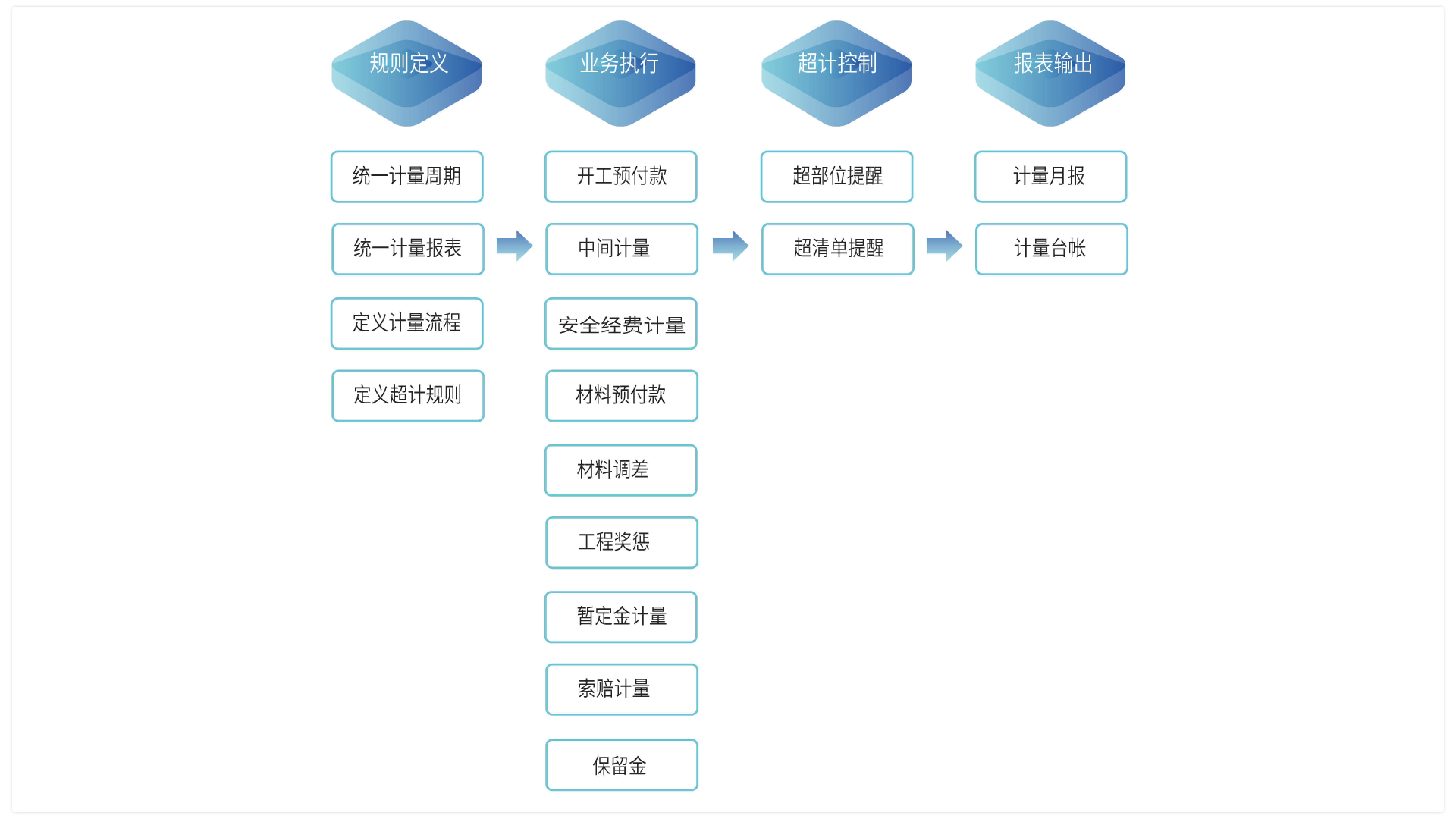 工程計量多方協(xié)調(diào),流程規(guī)范,程序合規(guī),適用多種承發(fā)包模式下的多種計量方式,計量支付全過程實時監(jiān)控,動態(tài)透明,程