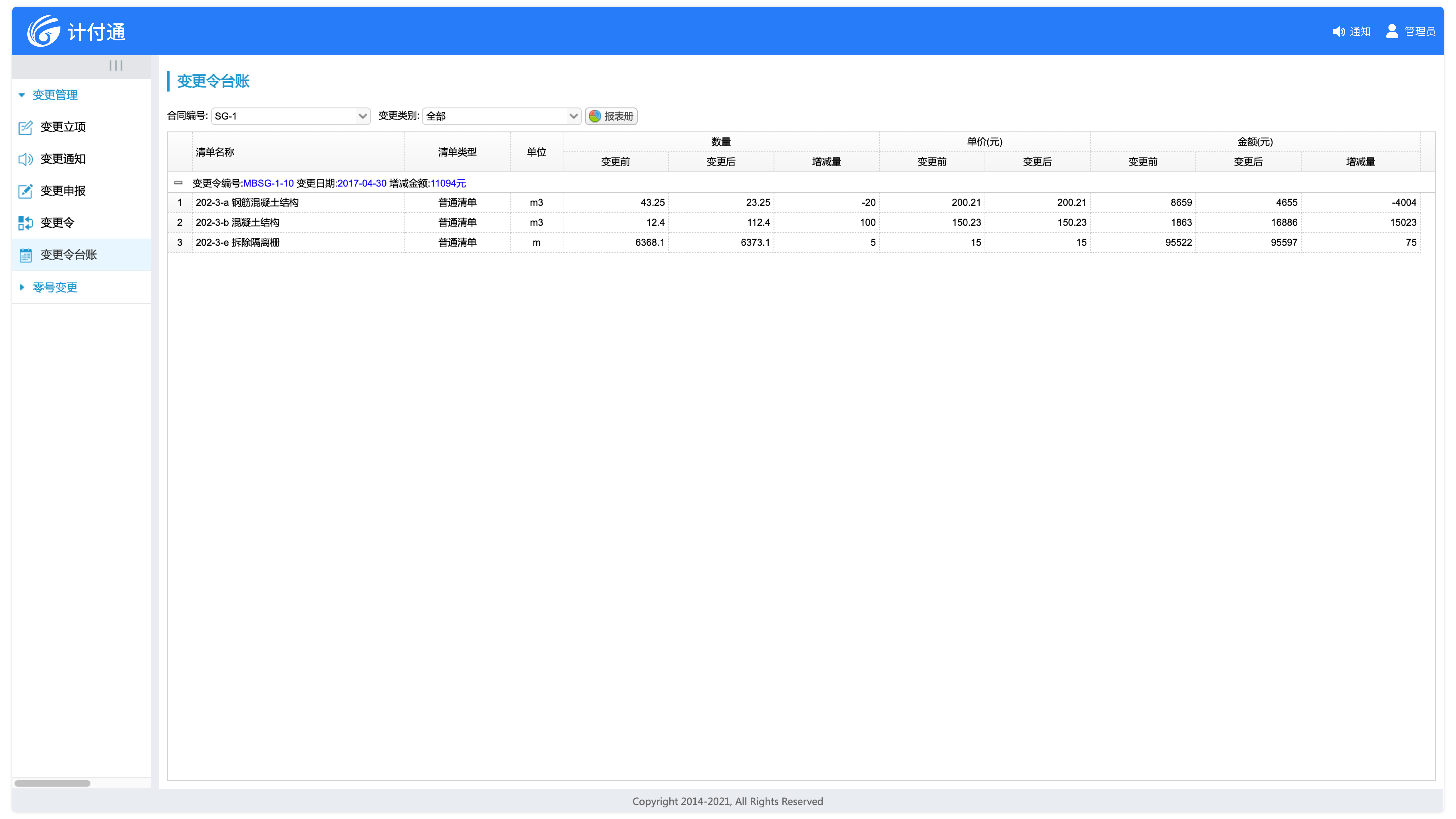 變更令生效后,變更數(shù)據(jù)實時同步至合同清單,作為變更計量的依據(jù)。
